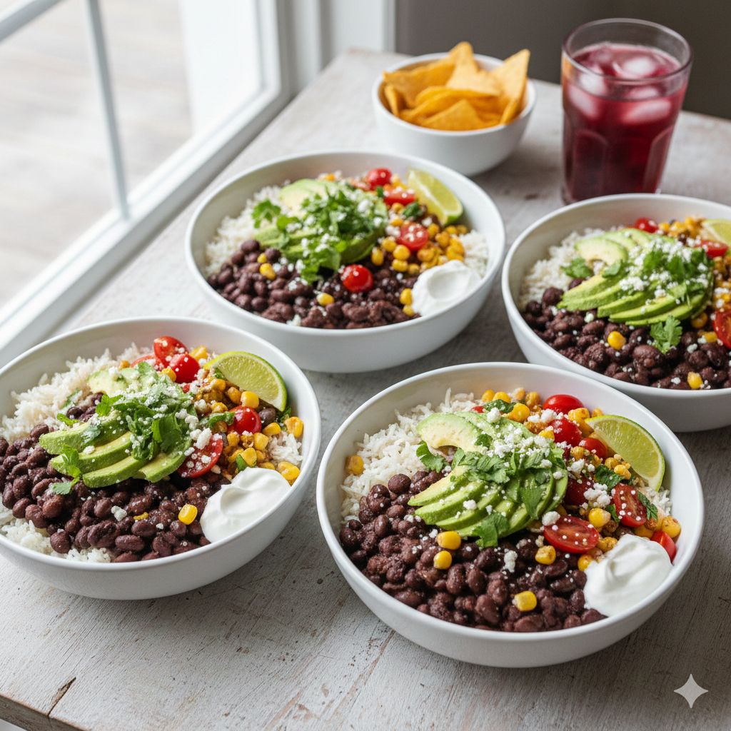 - Assemble the Bowls: Divide the rice into four bowls. Top each with a generous scoop of the spicy black bean mixture.