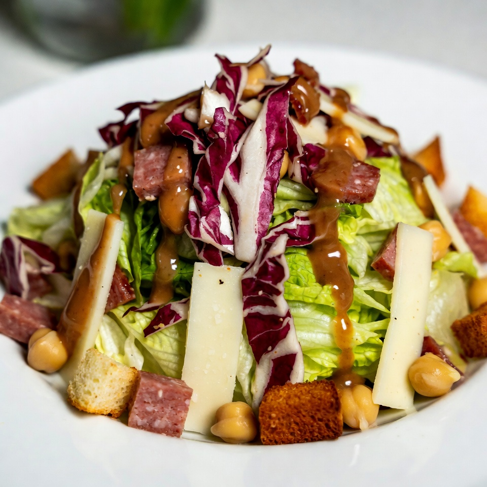 A: The La Scala salad relies on the specific “crunch” and high water content of iceberg. It provides a neutral, crisp backdrop that allows the bold flavors of the salami and tangy dressing to shine.