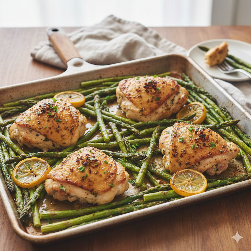 For a family-style look, serve the meal directly on the sheet pan placed atop a wooden trivet. For individual plating, nestle two chicken thighs over a bed of roasted asparagus, drizzling any remaining pan juices over the top.