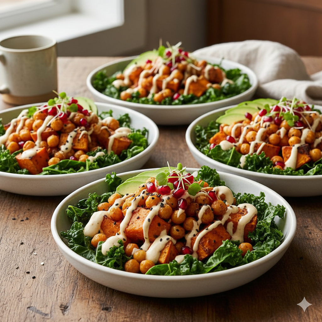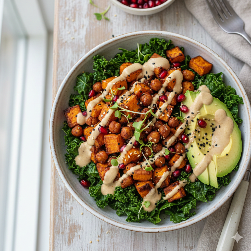 Health Benefits: This bowl is a powerhouse of Beta-Carotene (from sweet potatoes) which the body converts to Vitamin A, essential for skin health. The chickpeas provide Manganese and Folate, while the tahini offers a boost of Calcium and Magnesium.